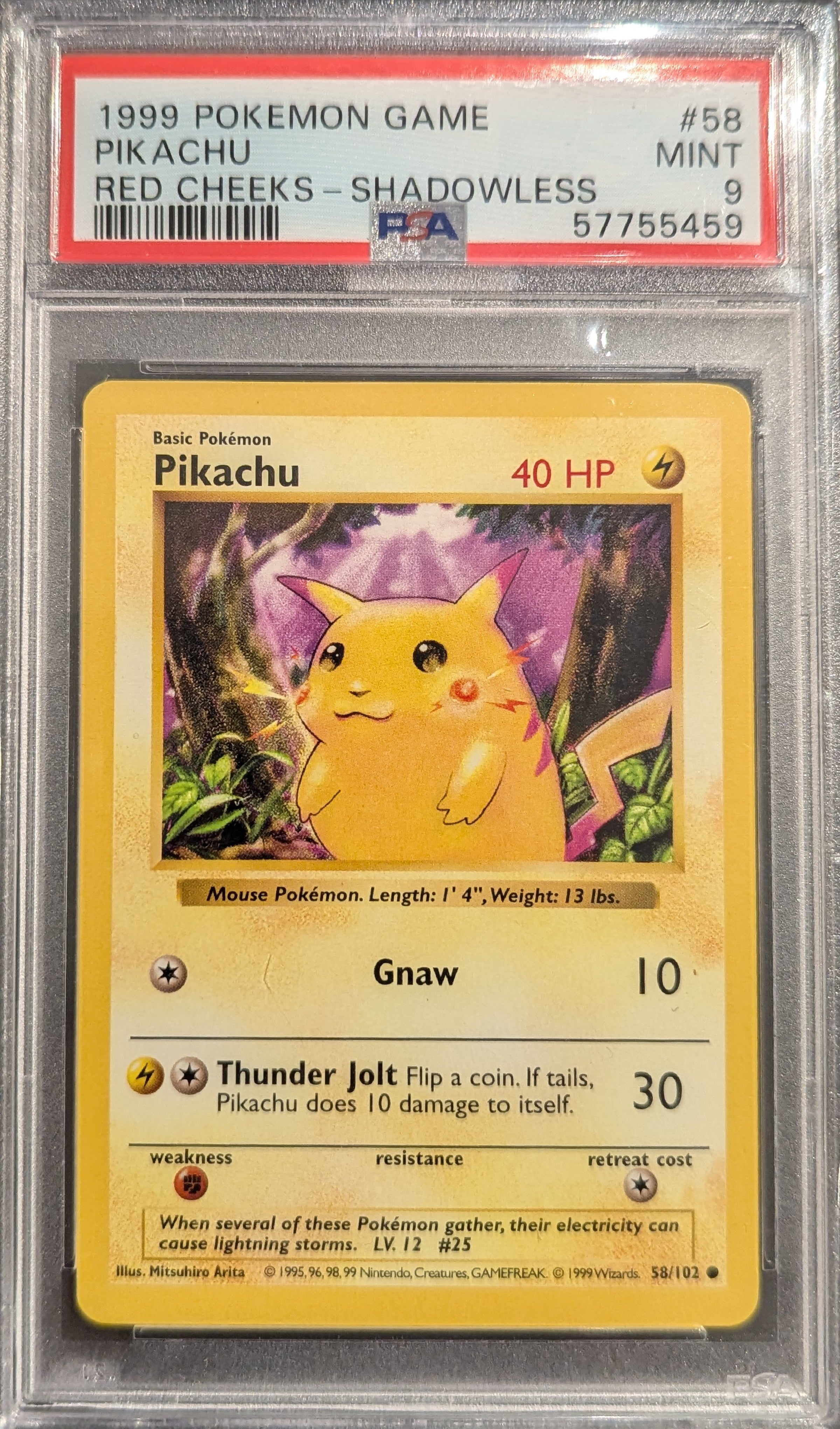 Pokemon TCG Graded Card: 1999 Pikachu Shadowless Red Cheeks #58 English PSA 9